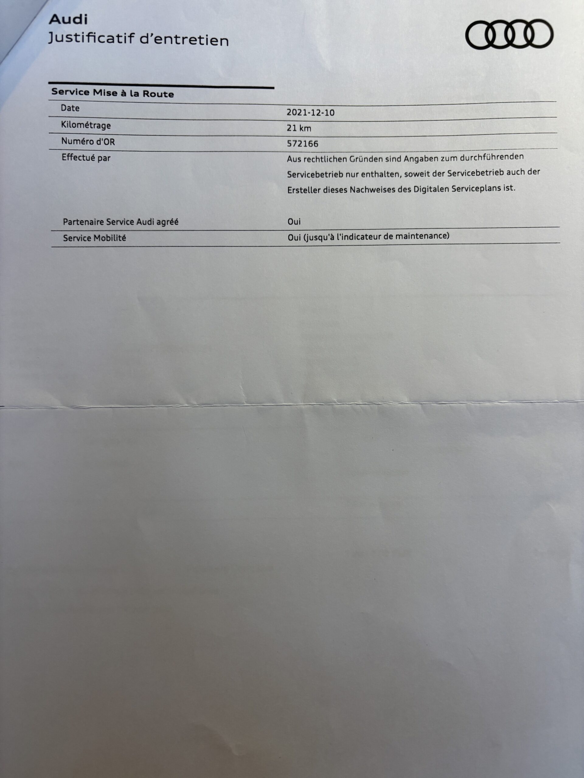 * 10/12/2021 – 21 KMS – Service mise en route Audi Bielefeld Allemagne.