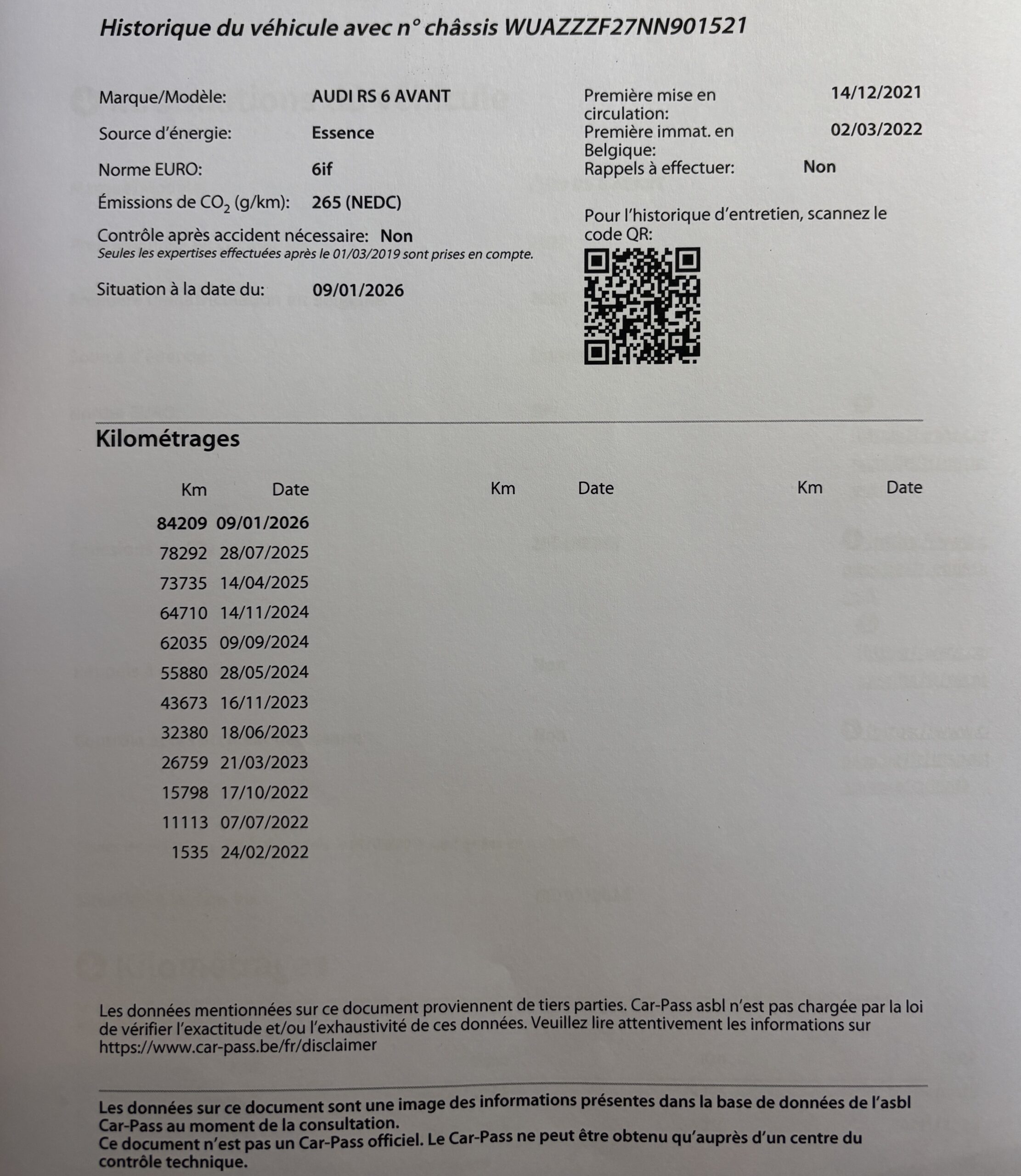 Vendu en février 2022 à 1535 kms par la concession Audi Bielefeld Allemagne au propriétaire et dernier propriétaire Belge.