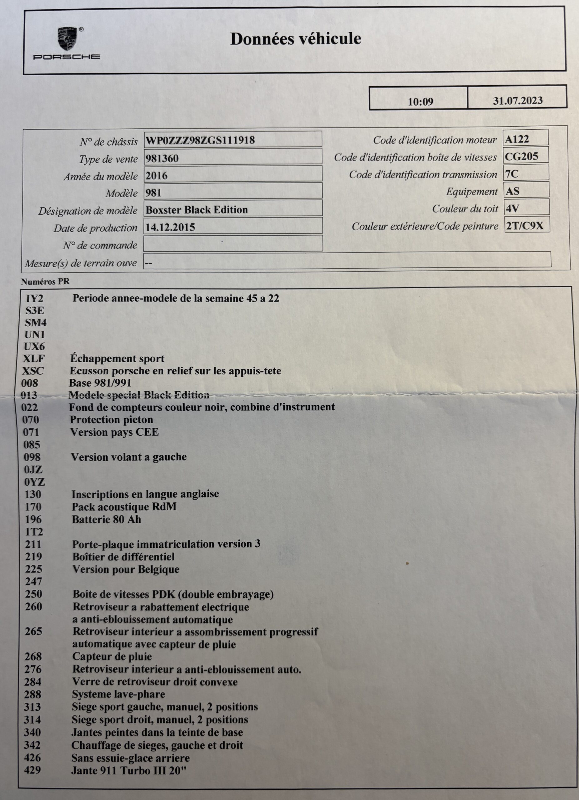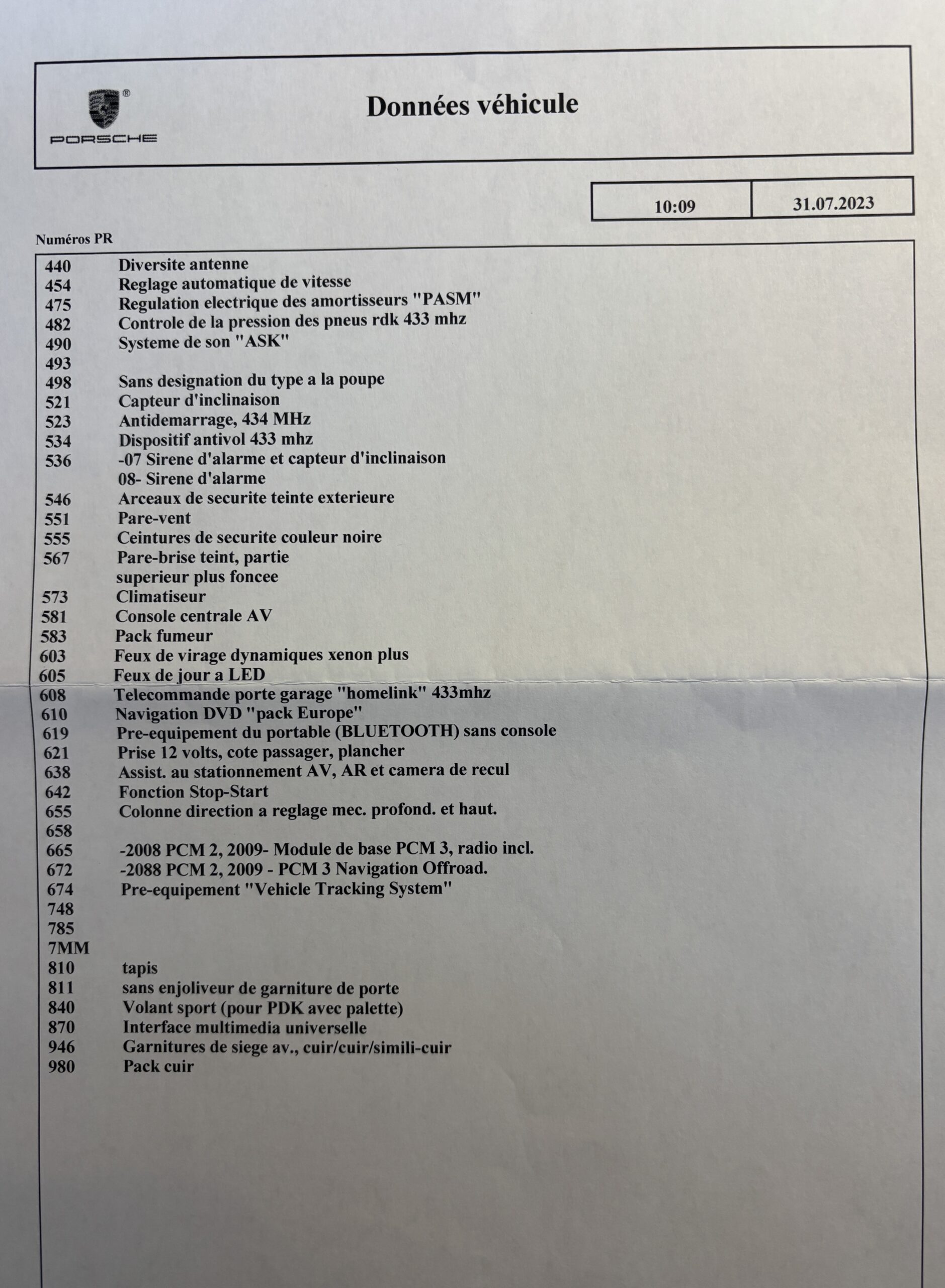 Black Edition – PDK – Sièges sport full cuir noir – Ecussons Porsche appuies-tête – Sièges chauffants – Jantes 20’’ Turbo – Seuils de portes alu Black Ed – Arceaux couleur carrosserie- Volant sport 3 branches cuir + palettes volant – Climatisation auto Bi-zone – PASM – PCM Porsche – BT – PDC av-arr – Caméra de recul – Finition alu – Bi-xénon feux de jours LED – Alarme – tablette compteur cuir …