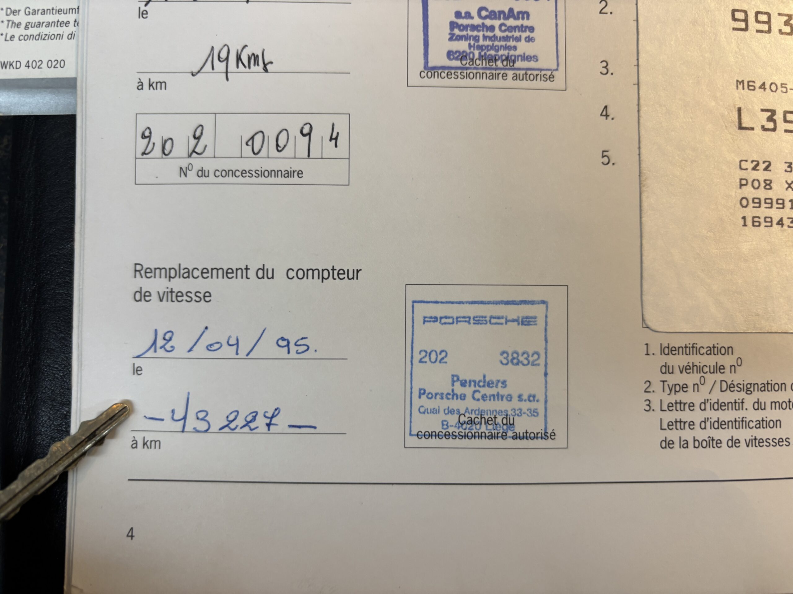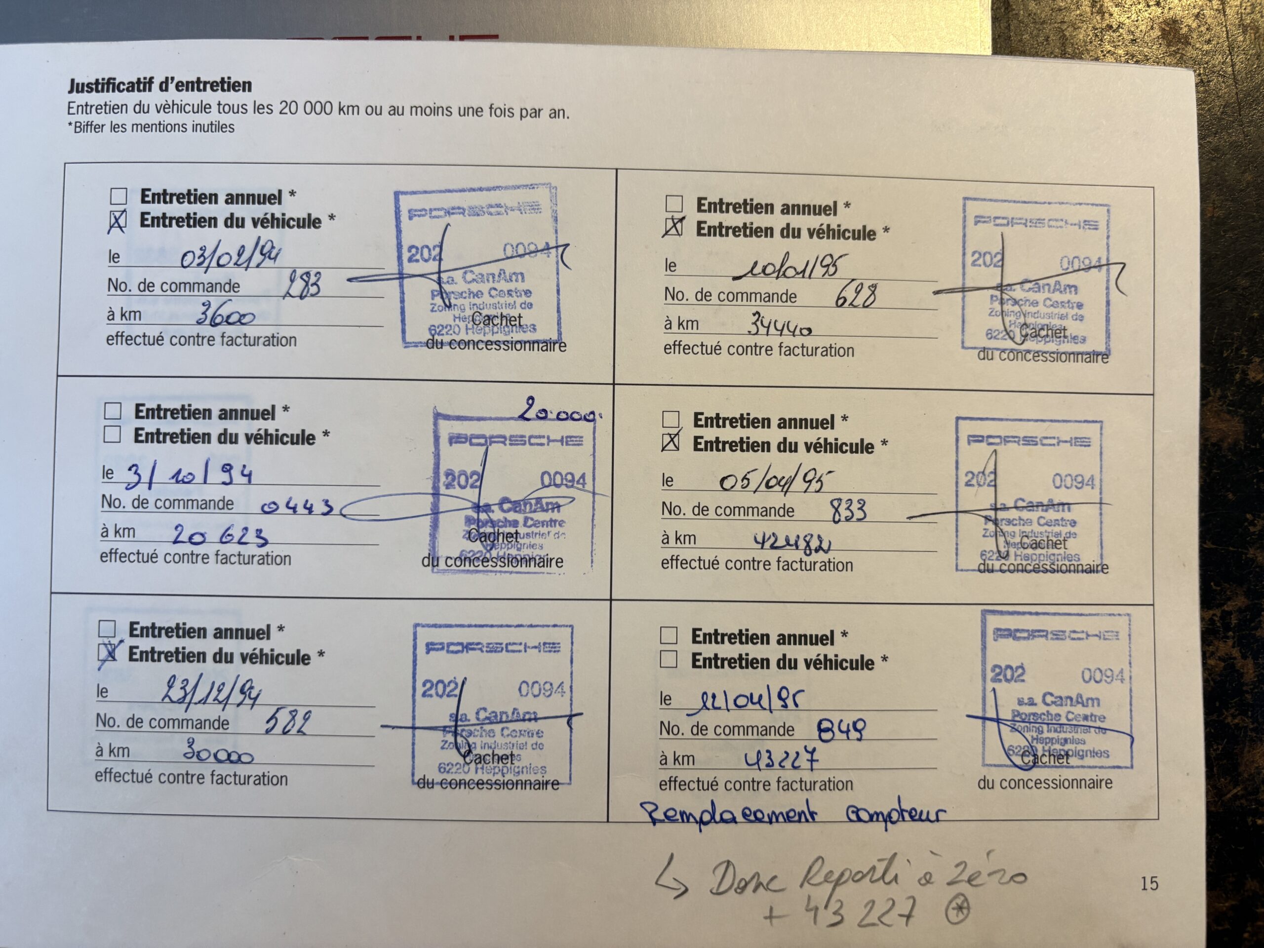 Notre Porsche 993 Carrera a eu son remplacement de compteur suite à un dysfonctionnement le 12/04/1995 à 43227 kms. Celui-ci a été remplacé par un compteur neuf au centre Porsche Penders Liège. ( voir cachet carnet première page avec photo en annexe ). Tout est également indiqué au dossier historique.