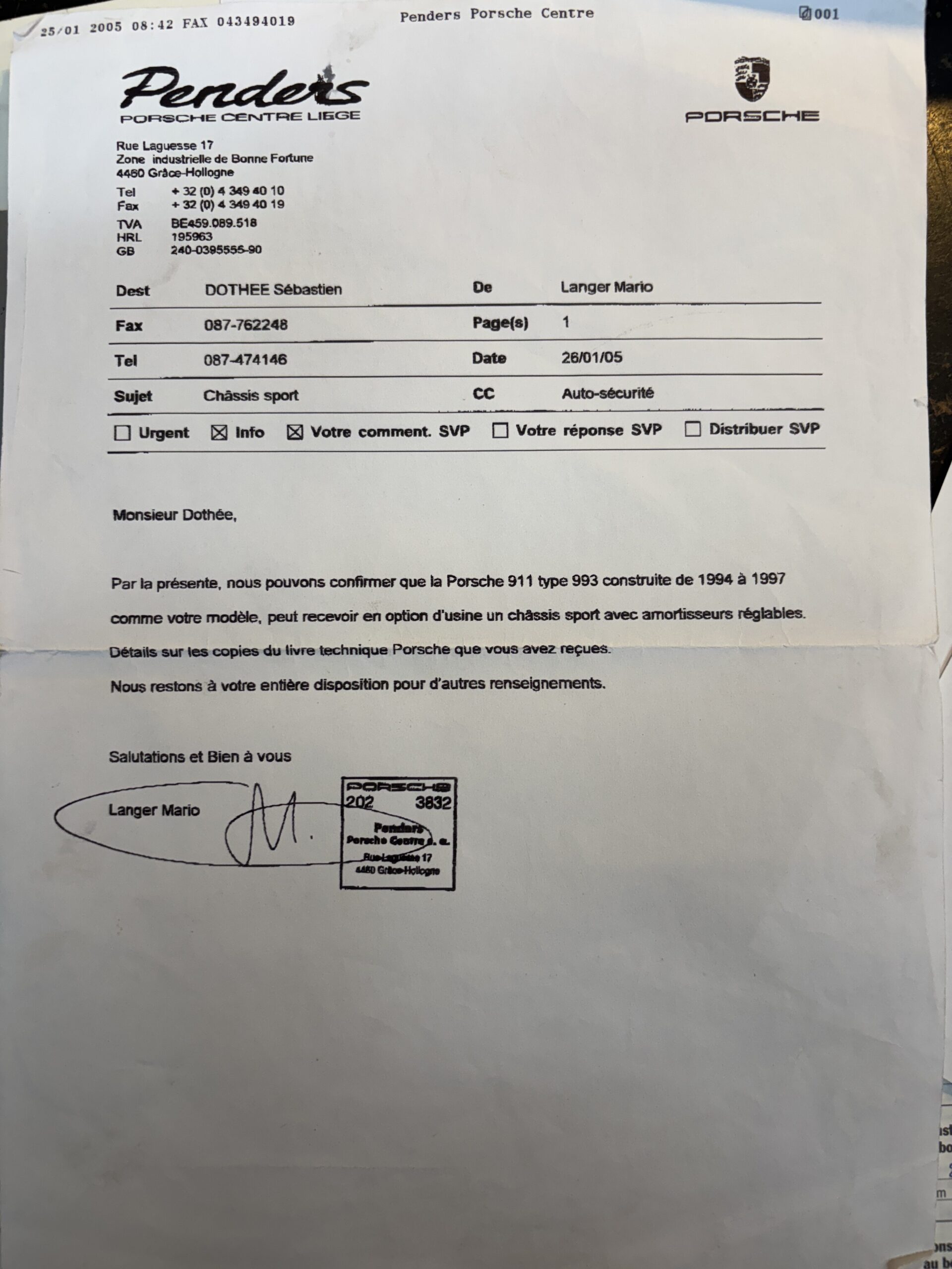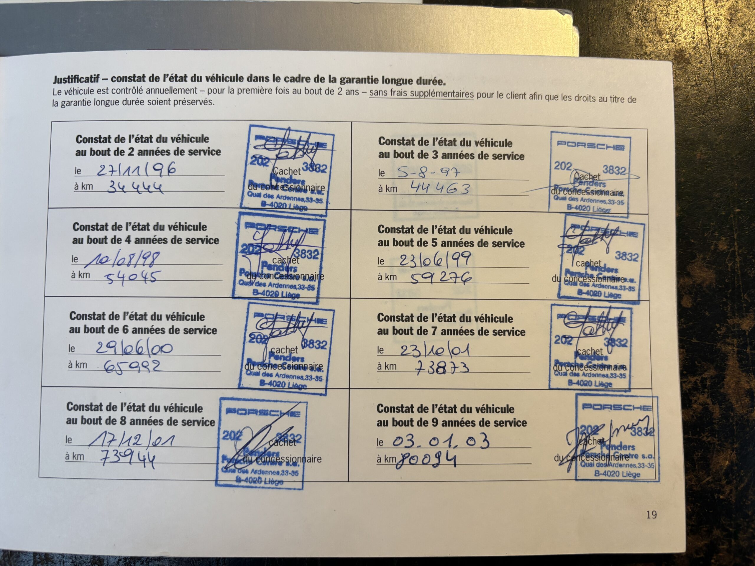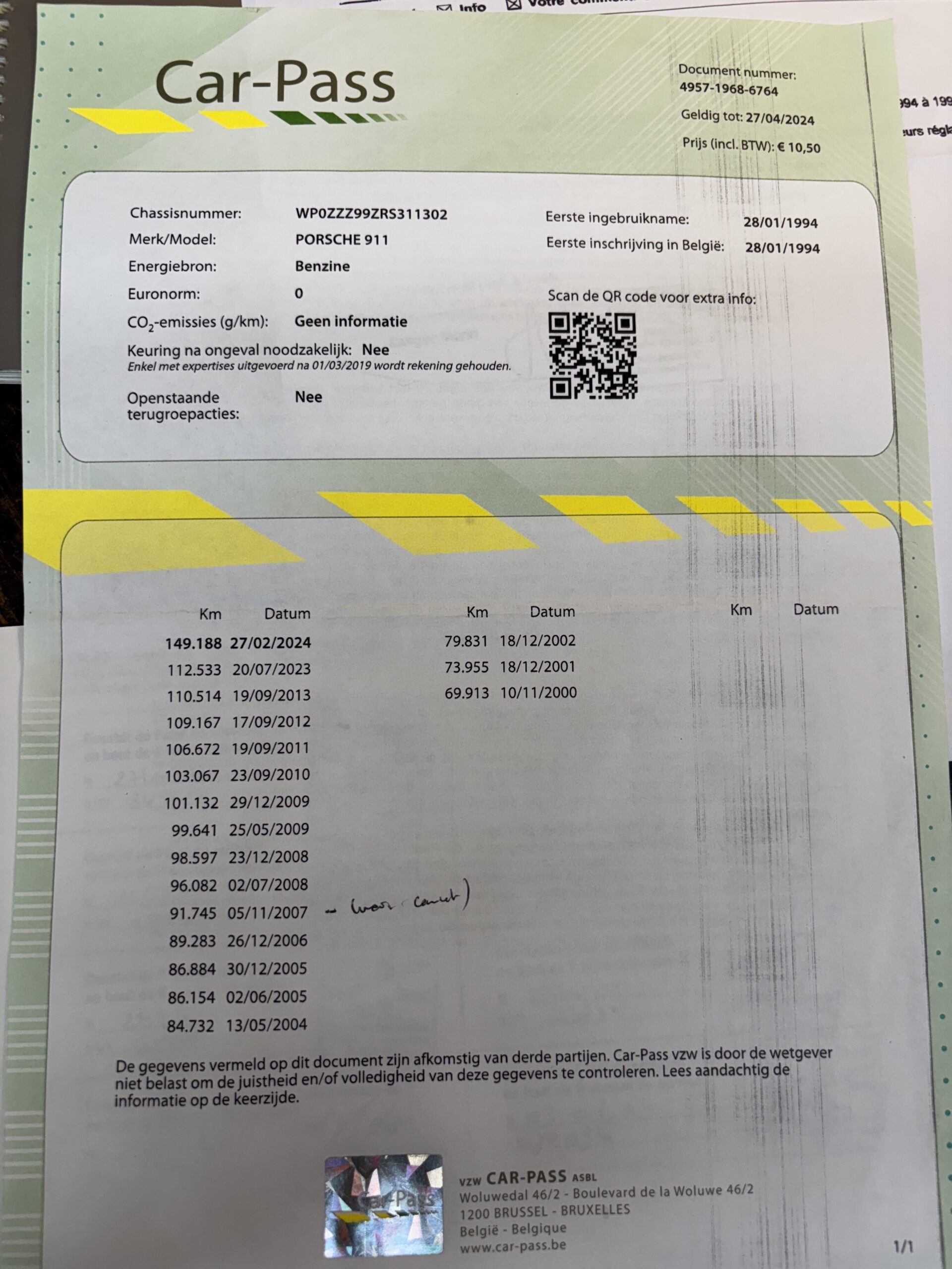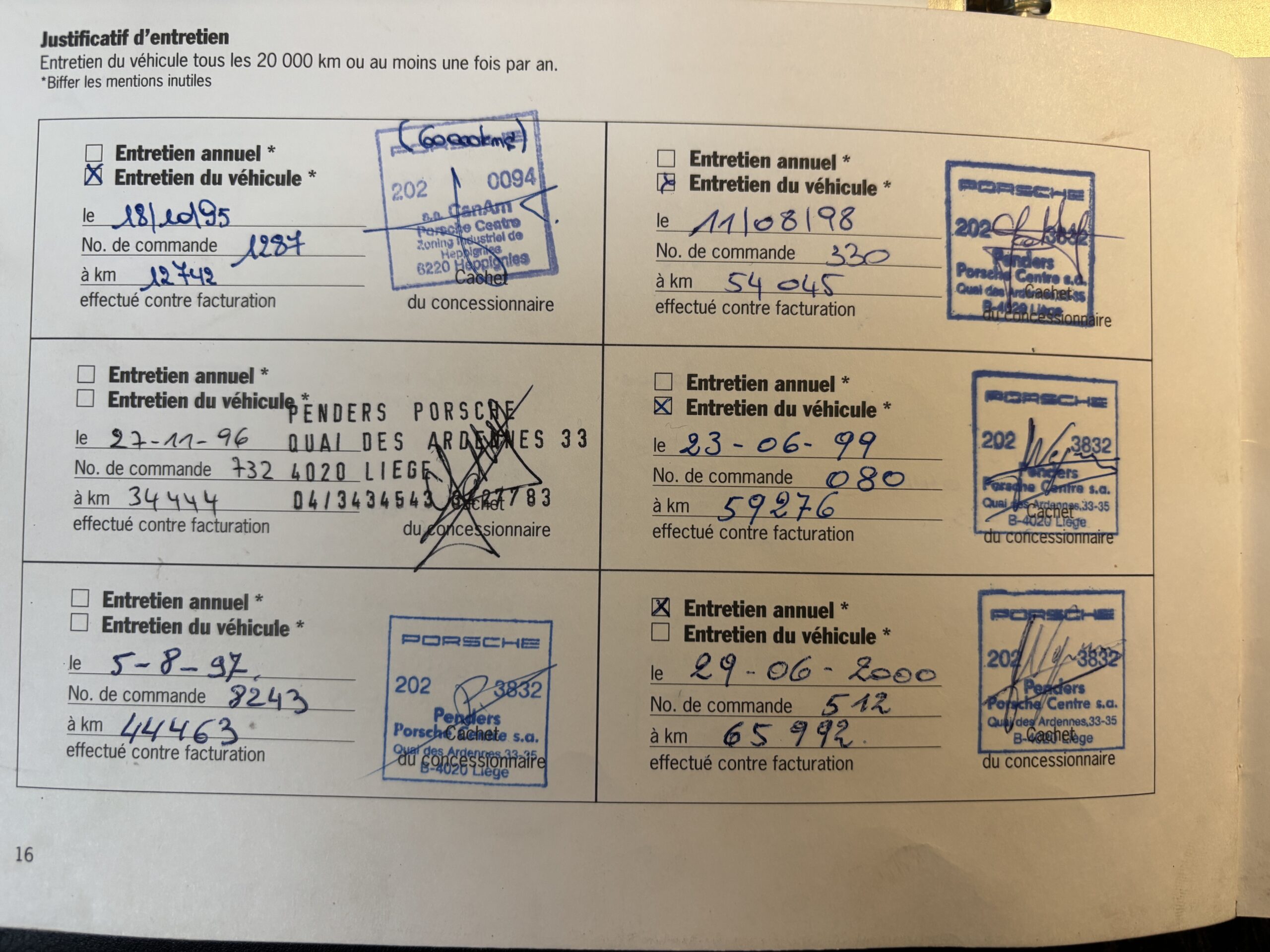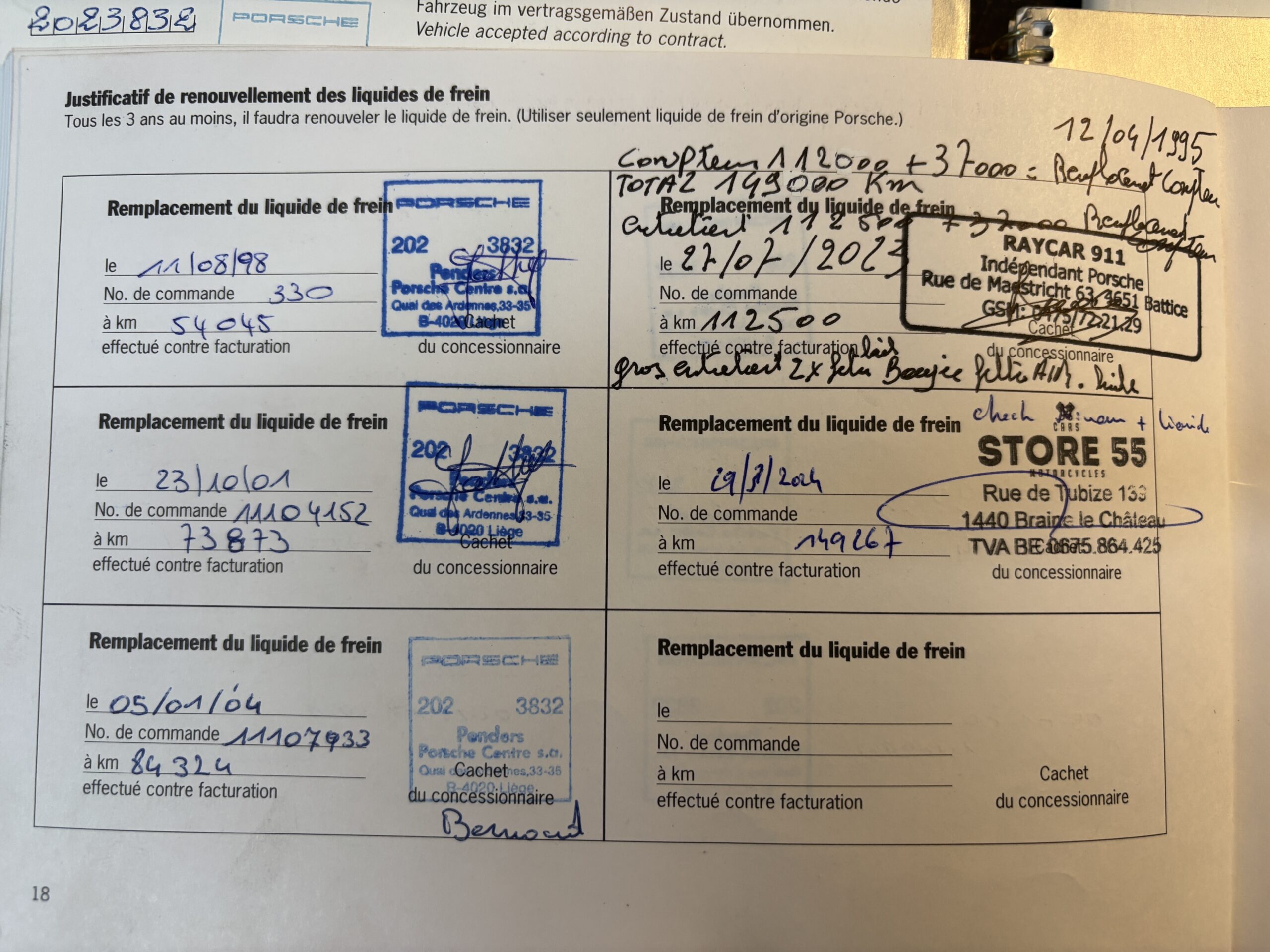 Véhicule entretenu quasi exclusivement par le centre Porsche CanAm Heppignies, et ensuite par le centre Porsche Penders Liège. Revendu par le centre Porsche Penders Liège en 2002 en Porsche Approved occasions.