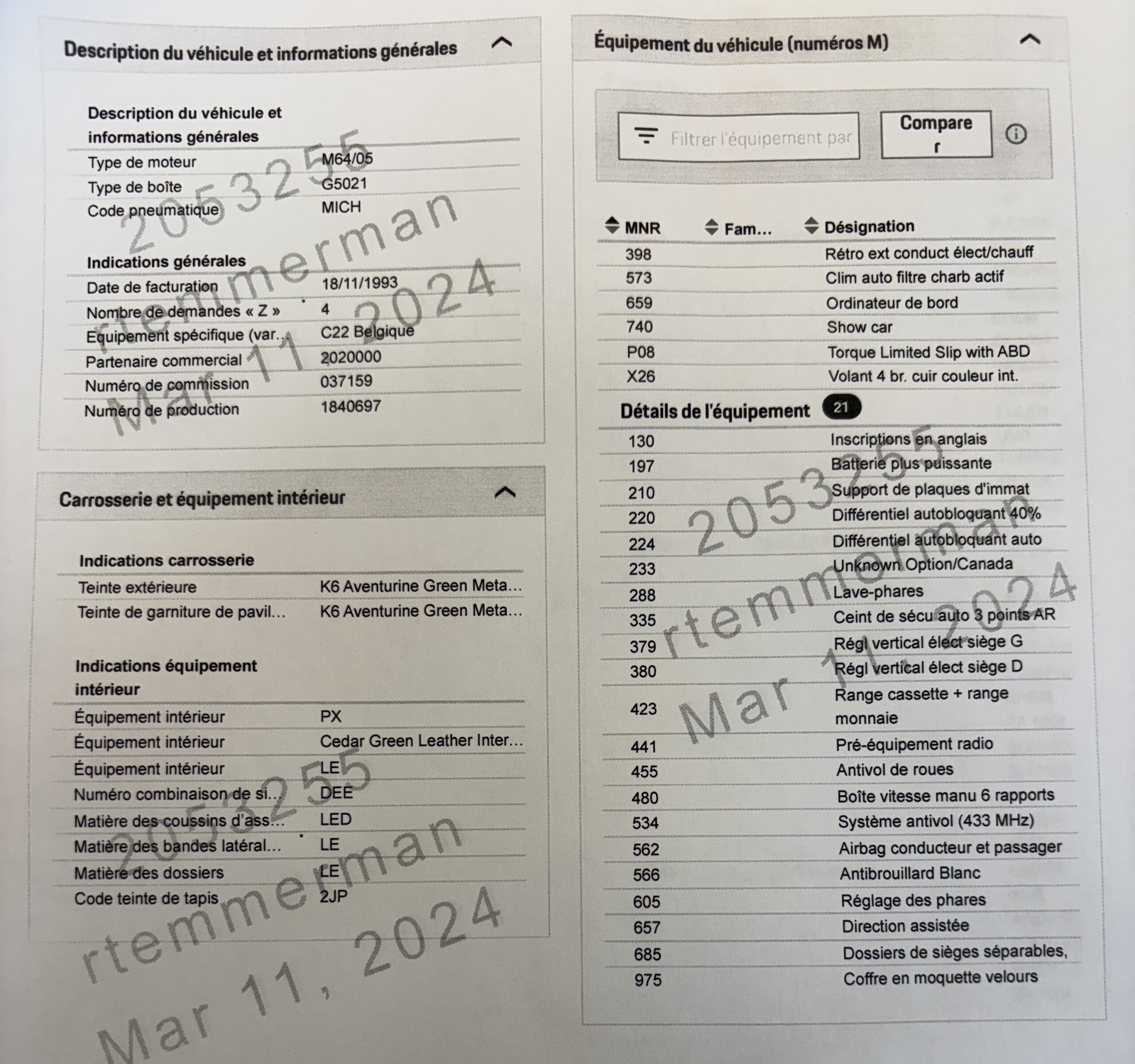 – Châssis sport – Différentiel autobloquant 40% 220/224 – P08 Torque Limited slip with ABD- X26 Volant 4 branche full cuir avec airbag cuir – Ordinateur de bord – 740 Show car – Climatisation automatique – Sièges électriques – 566 antibrouillards blanc – boîte de vitesse courte manuelle 6 vitesses – rétroviseurs ext chauffants – Sans essuies glace arrière – Tableau de bord en cuir – Intérieur full cuir Porsche Exclusif – Tableau de bord en cuir – Sièges full cuir – sièges arr full cuir – Panneaux de portes full cuir – Jantes 18’’ Turbo – Range K7 – code 740 Show car ( modèle expo ) …
