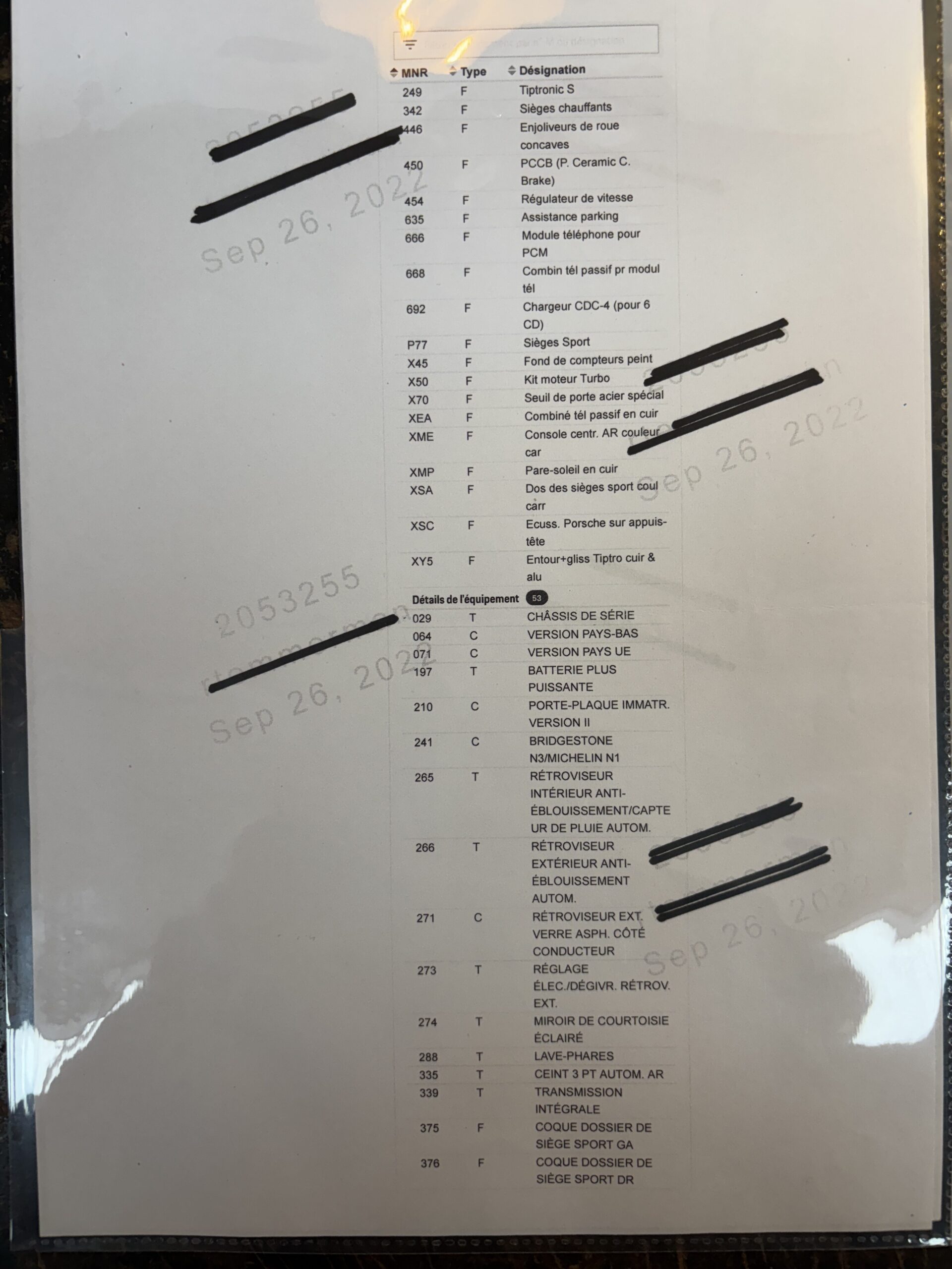 Sièges sport avec coque peinte couleur carrosserie – PCCB freins céramique Porsche – X50 Kit moteur Turbo ( + 30 cv ) – Pack BOSE – Tiptronic S – Sièges chauffants – Régulateur de vitesse – PDC arrière – Téléphone PCM – Chargeur 6 CD – X45 fonds de compteur peint – X70 Seuil de porte TURBO aluminium – XEA combiné en cuir – XME Console centrale couleur carrosserie – XMP pare soleil en cuir – XSA dos de sièges sport couleur carrosserie – XSC écussons Porsche appuies têtes – XY5 Entour + Gliss Tiptronic S en cuir & alu – Tableau de bord en cuir – panneaux de porte en cuir XME- miroirs de courtoisie éclairés – Windstop Porsche inscription – rétroviseurs anti éblouissement – 4 roues motrices – Jantes Turbo 2 18’’ – Volant sport 3 branches full cuir – airbag en cuir – capote électrique – lave phares – PSM – PASM – Alarme – Antibrouillards blancs – climatisation automatique – Éclairage Xénon – panneaux arrières full cuir – sièges arr full cuir – accoudoir central inscription Porsche…